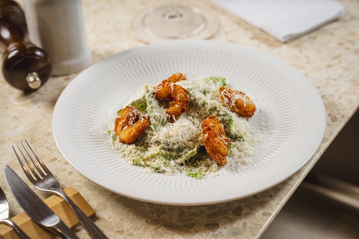 (Opção 1) Salada Caesar com Camarões Crocantes.