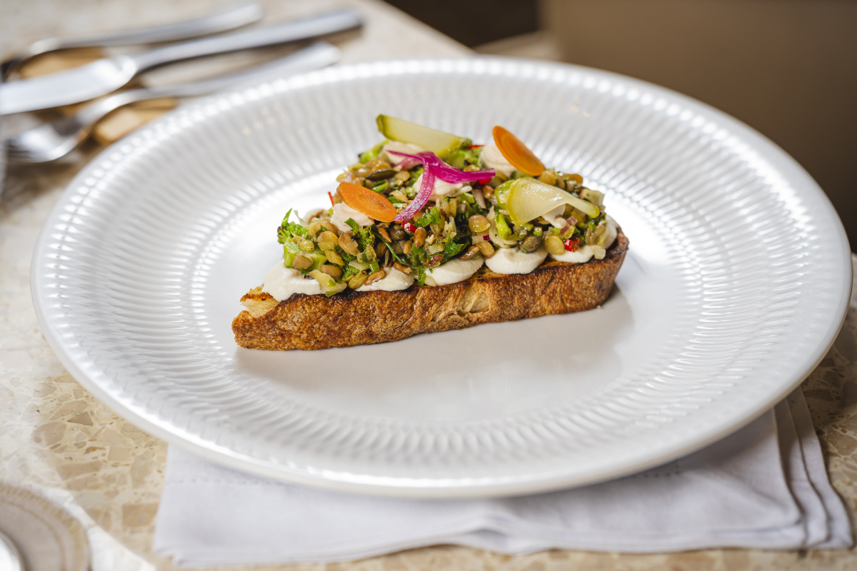 (Opção 2) Toast Salada Morna (pão sourdough, mix de grãos, brócolis, alho-poró e creme de ricota).