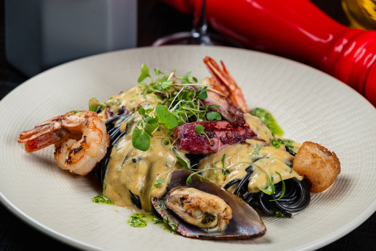 (Opção 2) Carbonara do Mar (espa- guete Nero com camarões, molho de tomate e queijo curado).