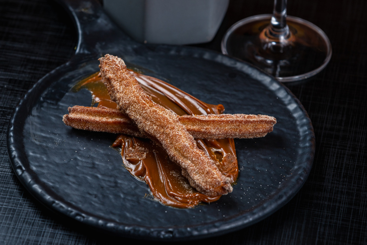 (Opção 1) Churros com Doce de Leite (churros fritos com canela, açúcar e doce de leite).