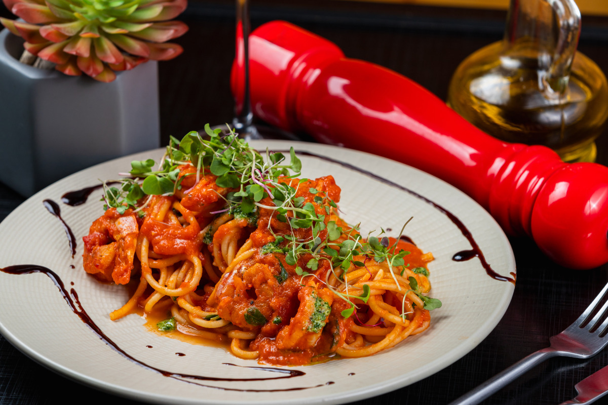 (Opção 2) Espaguete com Camarões (espaguete com camarões grelhados e molho de tomate fresco).