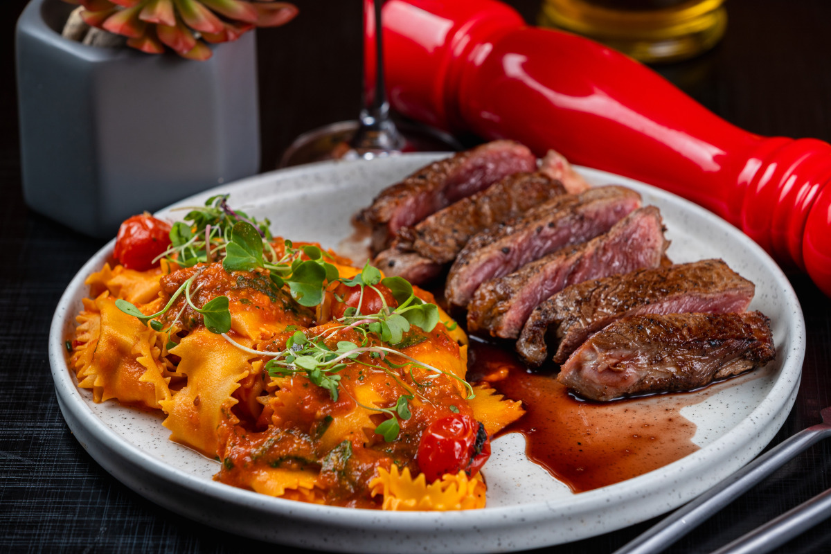 (Opção 1) Chorizo com Pappardelle ao Sugo (chorizo com demi glacê, massa fresca com molho sugo e pesto).