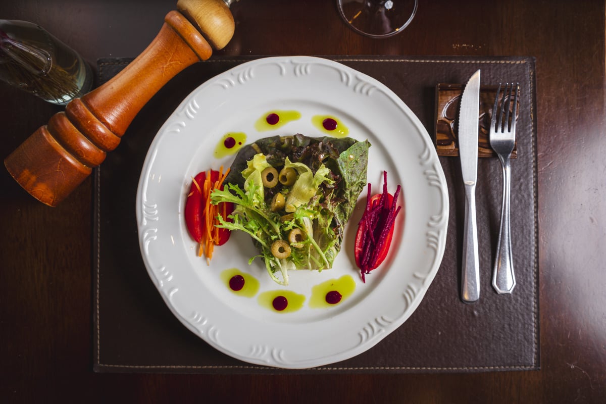 (Opção 1) Salada de Folhas Coloridas ao Molho de Frutas e Aceto Balsâmico.