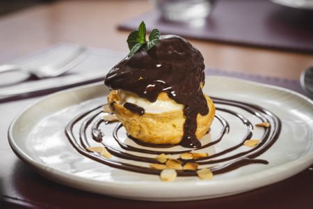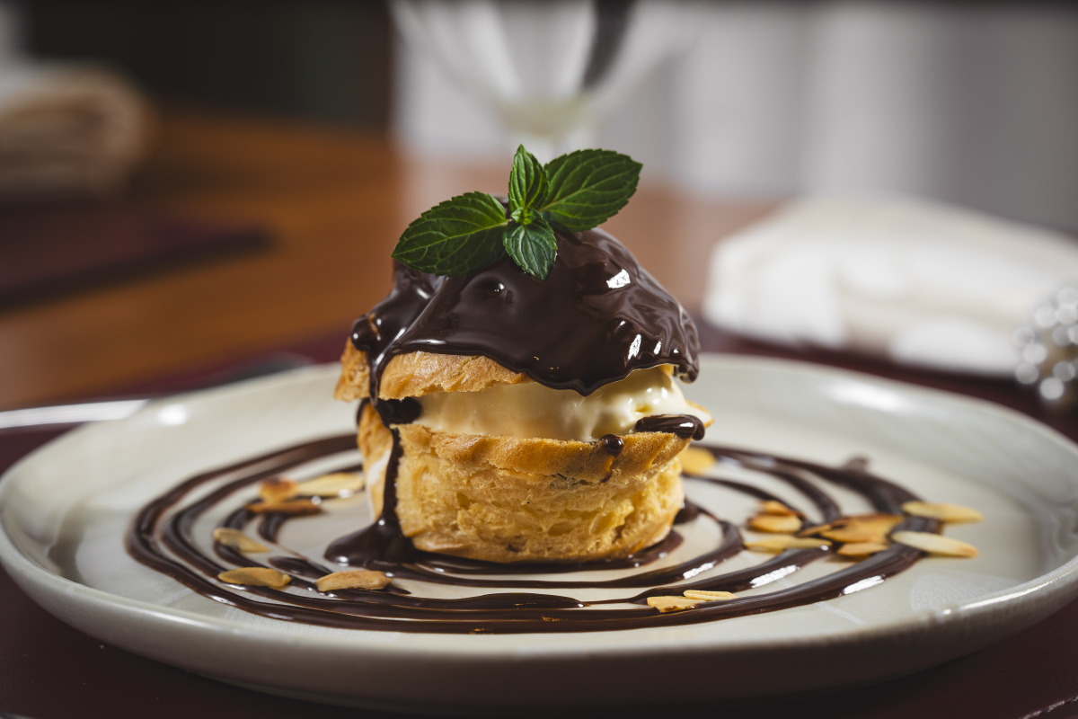 (Opção 1) Profiteroles (carolina com sorvete de amêndoas, ganache de chocolate meio amargo e menta).