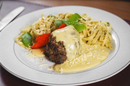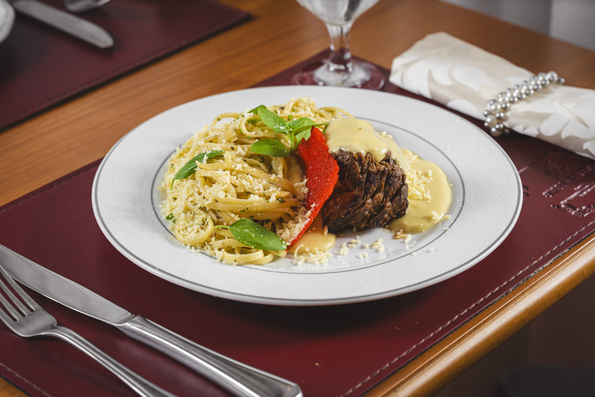 (Opção 1) Mignon Suíço (mignon Angus grelhado em fogo forte ao molho de queijo Suíço, acompanhado de fettuccine na manteiga).
