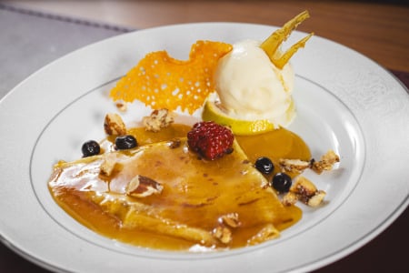 (Opção 2) Crêpe Suzette (crepe com redução de laranja, sorvete de creme e licor).
