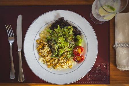 (Opção 1) Salada mediterrânea (grão-de-bico, queijos Suíço e Emmental e pistou francês, acompanha mix de folhas verdes e roxas, temperadas com emulsão de mostarda Dijon e mel).