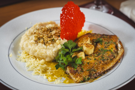 (Opção 2) Tilápia provençal (tilápia grelhada na manteiga provençal, palmito fresco e mix de ervas, flambado no conhaque e limão, acompanha risoto de parmesão).