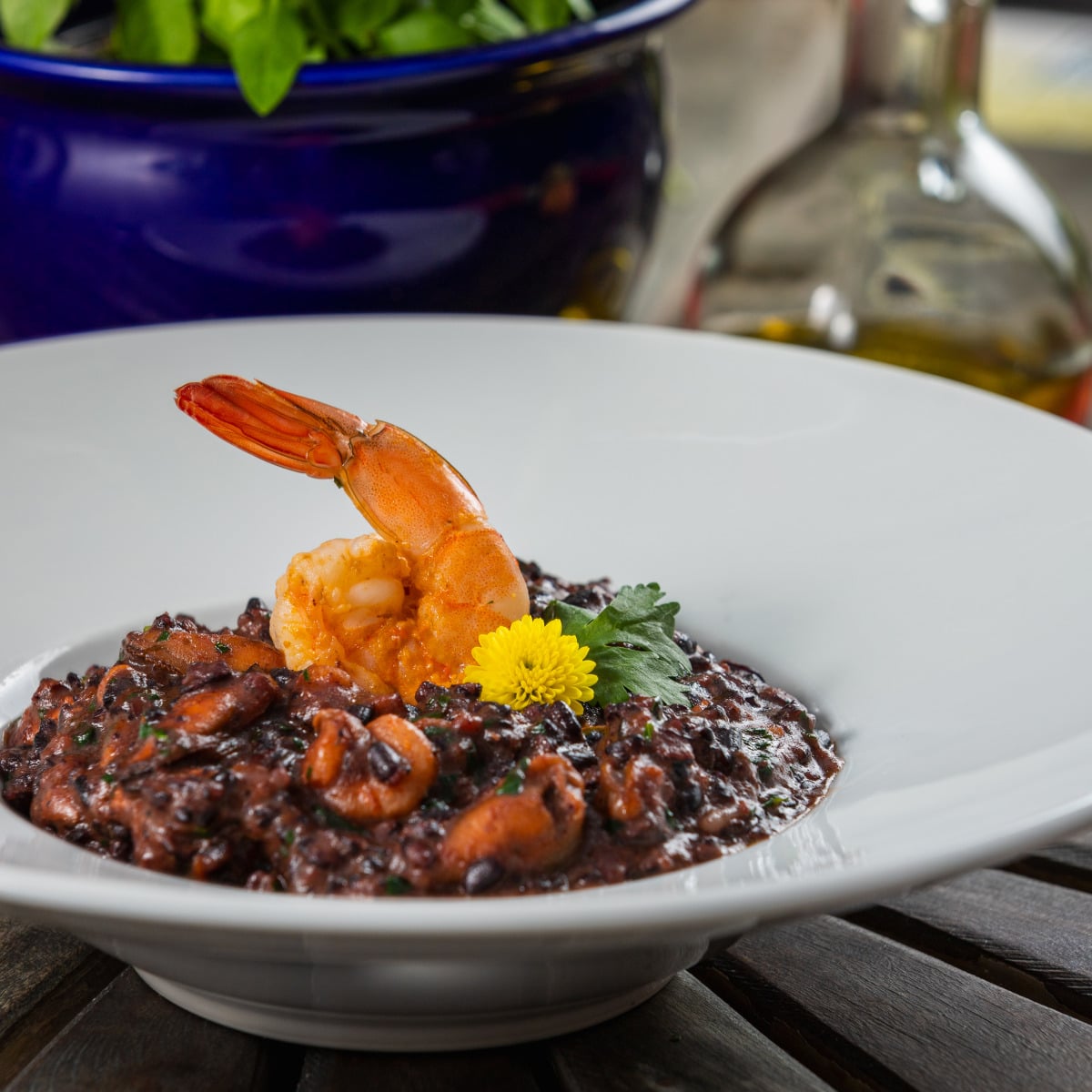 (Opção 2) Arroz Negro Al Mare (arroz negro com camarões e mexilhões).