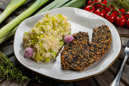 (Opção 1) Risotto de Alho-Poró (risoto de alho-poró guarnecido de filé de tilápia na crosta de gergelim).