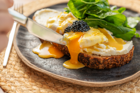 Para os fãs de ovos, o cardápio é uma ode ao brunch clássico com toques brasileiros: da panqueca com creme de queijo e ovas de ikura à panelinha com ovos poché, emulsão de tucupi e caviar, passando pelo omelete de camarão com capim-limão, tudo chega à mesa com apresentação delicada e sabor marcante. As tartines no pão sourdough também chamam atenção — em especial a versão com creme de queijo fresco, ovos poché, bearnaise amazônico e caviar de mujol, e a criativa combinação de presunto parma, queijo de cabra, gorgonzola doce e figo fresco.