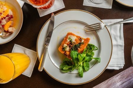 Os pratos principais seguem com Ravioli de abóbora com alcachofras crocantes, molho de manjericão e pinolis; Bacalhau à Belle Meunière com camarões, batatas assadas, alcaparras e ervas frescas; Tagine de cordeiro com couscous, legumes orgânicos, pistache e especiarias. Para a seção de sobremesas, a chef pâtissier Saiko Izawa preparou Torta Banoffee, Cheesecake com blueberry e Ovos de chocolates recheados. O menu de brunch ainda conta com uma versão vegetariana e vegana. O valor do brunch é de R$ 600 mais taxa de serviço, incluindo Champagne Perrier-Jouët Grand Brut e os drinks Rabbit’s Tail e Cacao Noir, além do mocktail Aurora. Crianças até 5 anos podem desfrutar do brunch como cortesia, enquanto o valor para os pequenos de 6 a 12 anos é de R$ 300.