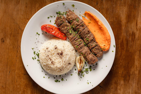 Também tradicional, o Kebab tem algumas versões no menu. Entre elas, destaque para o Kebab com nozes (R$ 65,90). Nesta opção, traz dois espetinhos de carne bovina grelhada e temperada com especiarias árabes, pimentão, cebola e nozes. O prato ainda oferece cebola e tomate assados, pasta de alho picante e pasta de alho com ervas. Para acompanhar, o cliente pode escolher o tipo de arroz: branco, com aletria, com lentilha ou com tâmaras e passas.