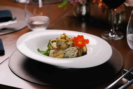 Nos pratos principais, o Fetuccine de Pupunha, guarnecido de coração de alcachofra é embelezado pelas flores, o Tofu Defumado, acompanhado de purê de brócolis e legumes grelhados, também recebe o toque floral, ambas são algumas das opções vegetarianas que o restaurante oferece.