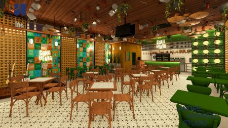 Na sequência, o samba e o pagode ganham destaque no Bar CanaBenta, clássico da boemia curitibana, com luminárias instaladas em pandeiros, que foram desenhados especialmente para o espaço. O piso é de ladrilho hidráulico; os cobogós amarelos remetem à década de 1970; e as grades de ferro completam a estética de uma casa brasileira típica. “É um projeto que fala de memória afetiva e que celebra o nosso cotidiano com humor e identidade”, destaca o arquiteto.
