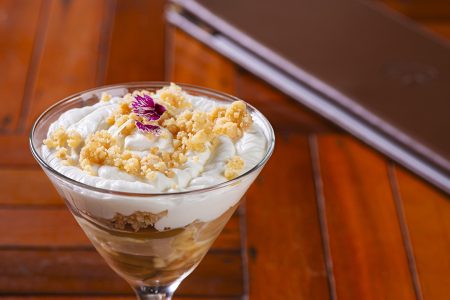 Para sobremesa, a novidade é a Banoffee desconstruída. Nessa receita, a banana é curada em uma calda com canela e depois vai para a taça com doce de leite, chantilly e crumble na cobertura. Outras opções de sobremesa fixas são o sorvete de nata ou a salada de frutas.