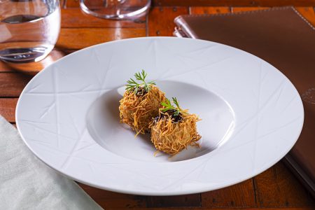 Como entrada, o cliente pode escolher a Salada do dia, com os vegetais mais frescos do dia, ou o Croquete 4 Queijos. Essa entrada, inédita na casa, é um clássico do chef na época que atuava no Aqueces Bar, no São Francisco. “Era um petisco que saía muito e resolvi colocar como entrada aqui também. É um croquete com queijos parmesão, provolone, gorgonzola e gouda, empanado na aletria e servido com redução de balsâmico com morango”, explica Thiago Abduch.