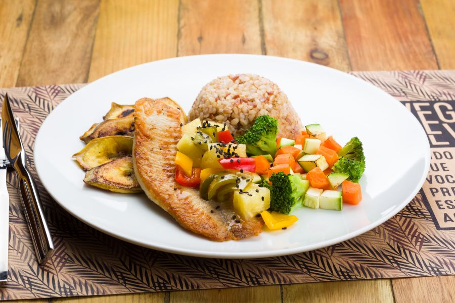Há quatro anos, o Veg & Lev cumpre a promessa de mostrar que comida saudável pode ser, sim, muito saborosa. O serviço a la carte não tem foco em dietas, mas na alimentação consciente e nutritiva – os pratos são divididos em opções veg (veganas) e lev (com baixa caloria, porém, com proteína animal). Um dos destaques fitness do menu do restaurante original fica com a tilápia fit (filé de tilápia ao molho agridoce de abacaxi e pimentões com mix de legumes, fatias de banana-da-terra grelhadas e mix de arroz cateto com vermelho; R$ 28,90).