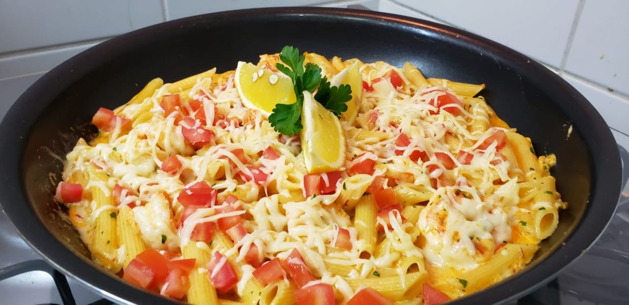 RECEITA: Penne com Camarão Rosa ao Molho Picante de Patê Mexicano, Limão Siciliano e Gruyère!
