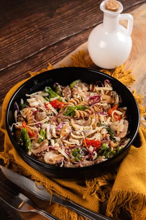 • Já a Macaroni Pesto Salad (R$53) combina fusilli integral com molho pesto artesanal, escarola, repolho roxo crocante, cogumelos paris, tomate seco, cubos suculentos de mignon e parmesão ralado — uma salada quente, sofisticada e irresistível.
