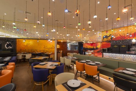 “Este é um estabelecimento árabe contemporâneo que entrega muitos elementos dourados, mármores em especificações específicas, riquezas provenientes do Cairo e o efeito “nuvem colorido” é fornecido pelas riquezas oriundas da Turquia. Todos os detalhes que enaltecem o projeto, como o revestimento do teto com textura de areia para representar o deserto e as artes temáticas assinadas por Rosangela Grafetti, evidenciam o reforço da identidade cultural”, detalha Bez.