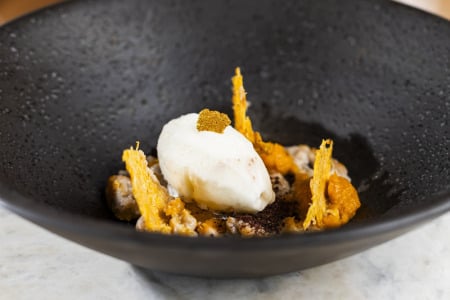 Já o “Milho Seen” (R$ 38) apresenta uma releitura inovadora de ingredientes tradicionais. A mousse de palha de milho, leve e cremosa, harmoniza com o creme de uvaia e a crocância da tuile de milho, complementados pela refrescância do sorbet de abacaxi. É uma sobremesa que celebra os sabores brasileiros de forma elegante e delicada.