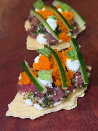 - Crocante de tapioca com carne crua, coalhada seca, picles de pepino, hortelã e farinha de quibe – textura e acidez em equilíbrio.