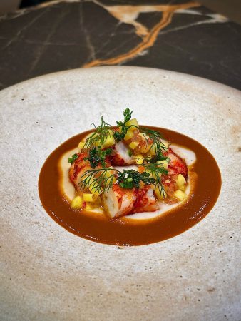 Na sequência, o primeiro prato é um destaque técnico e sensorial: Carabineiro assado na churrasqueira, servido com creme de coco defumado, molho intenso de carabineiro, vinagrete de manga verde, limão caviar e endro.
