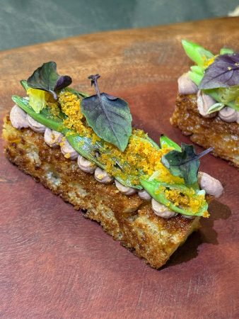 - Pão de milho com patê de galinha, melado fermentado, bottarga, laranja e manjericão – agridoce, defumado e cítrico.