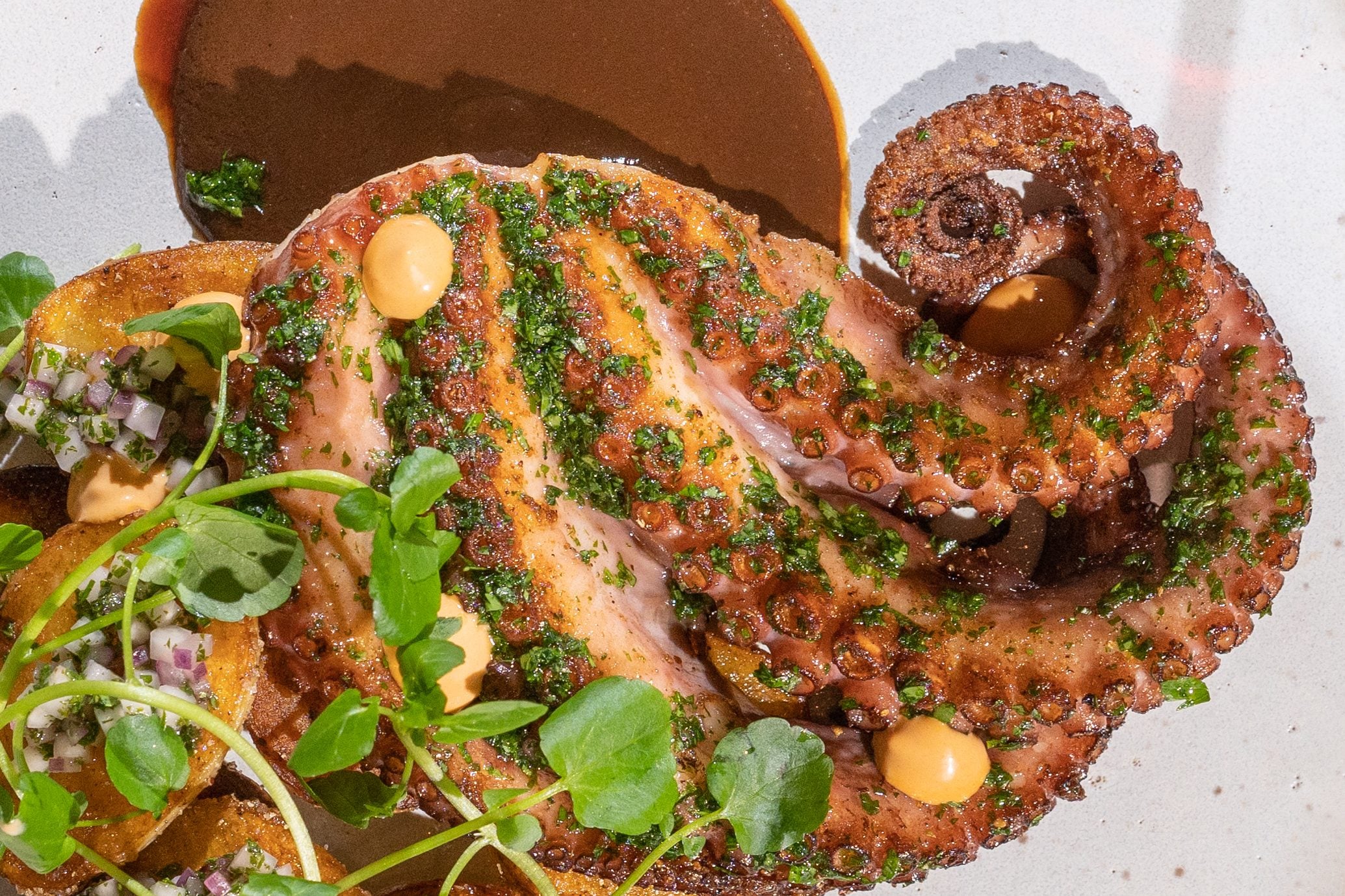 Polvo na brasa – acompanhado de batata salteada na manteiga com alecrim, vinagrete de couve-rábano e ervas, molho de alho negro e emulsão de pimenta chipotle.
