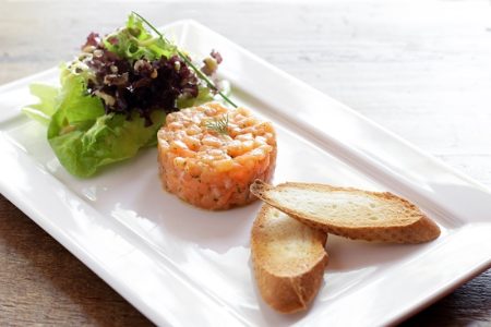 A mise en bouche será um Tartar de salmão, servido com torradinhas e folhas, acompanhado do espumante da Borgonha Dame Claudette Marie Brut.