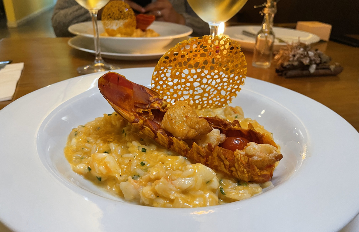 A Lagosta com risoto de açafrão será servida, por 295 reais, para duas pessoas. Já a Cauda de Lagosta com risoto de uvas é uma das duas opções de prato principal no menu completo de Namorados que sai por 120 reais por pessoa, incluindo duas taças de espumante.