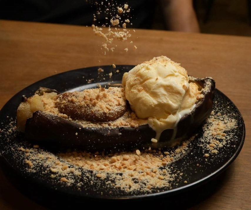 Leve a banana com casca para assar em forno com temperatura média. Retire-a quando a casca estiver totalmente assada e bem escura. Corte a banana ao meio deixando a casca como suporte, apertando as ponta para formar uma barquinha. Coloque o doce de leite sobre a fruta e, por cima, coloque a bola de sorvete. Quanto ao preparo da farofa, basta juntar todos os ingredientes. Por fim, salpique a farofa doce sobre a banana.