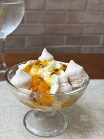 Em uma taça funda e faça camadas de chantilly, suspiros e manga, finalizar com a calda de maracujá.