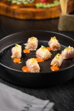- Tiradito Passion: Lâminas de salmão servidas com um molho de physalis e maracujá, finalizadas com coco crocante. Uma explosão de sabores tropicais que traz um contraste vibrante entre doçura e acidez.