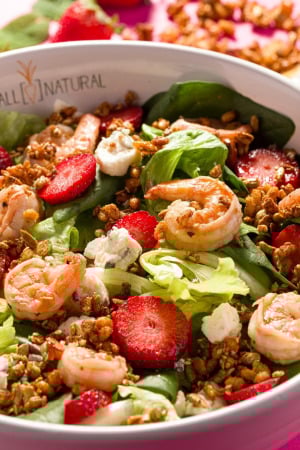 ALLoha Salad: Base de alface americana e crocantes folhas de espinafre frescas, camarões grelhados, faDas de morangos, queijo gorgonzola, envoltos por um delicioso molho de morango agridoce com toque de hortelã. Finalizado com a famosa granola da DINDA®. Uma mistura simplesmente fresca e deliciosa.
