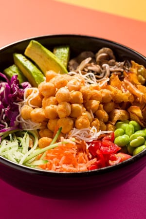 Mahalo Poke Vegano: Pensando sempre em agradar todos os paladares, a versão vegana do Poke é uma explosão de sabor e saúde. Em sua base o leve e saboroso bifum (macarrão de arroz), adicionamos grão de bico temperado clássico da receitinha ALL, com toque de páprica e cogumelo paris grelhado. Acompanhado de cenoura, pepino, moyashi, repolho roxo, tomate cereja fresco, abacate, edamame e chips de batata doce. Coroado com o molho de vinagrete de manga, esse prato vai te surpreender