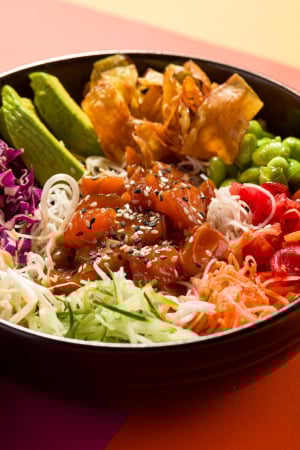 Mahalo Poke: Esse prato típico Havaiano ganha sua verão ALL com o inusitado salmão black defumado e como base o leve e saboroso bifum (macarrão de arroz). Acompanhado de cenoura, pepino, moyashi, repolho roxo, tomate cereja fresco, abacate, edamame, chips de batata doce e toque de mix de gergelim. Com um grand finale perfeito o molho de vinagrete de manga, que equilibra os sabores com sua doçura tropical e um toque de acidez.