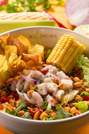 Ensalata de ceviche peruano: Embarque em uma viagem ao Peru e se delicie com esse prato \pico transformado em salada pelo All. Base de mix de alfaces (americana, roxa e crespa), cenoura e tomates cereja. Ao topo o Ceviche (peixe branco marinado no limão, com cebola roxa, pimenta dedo de moça, e leve toque de coentro), acompanhado de milho cozido na espiga. Finalizado com chips de batata doce e toque de milho crocante salgado.