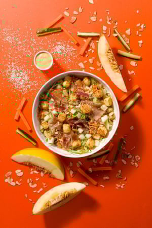 Melon ALL dijon: Base de alface americana, finas faDas de presunto de Parma cru que faz uma harmonização surpreendente com o melão doce, acompanhando de pepino e cenoura, trazendo crocância e frescor. Finalizada com vinagrete de mostarda Dijon, mix de sementes e amêndoas e delicioso dadinho de tapioca com queijo parmesão assado ao forno.