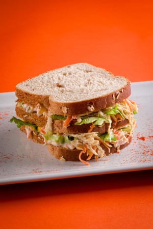 NaturALL de frango: Pão integral de fermentação natural, cremoso patê de frango com cenoura ralada, cebolinha, toque de cebola branca, milho, picles e gotinhas de limão garantindo aquele frescor, acompanhado de crocante alface americana.
