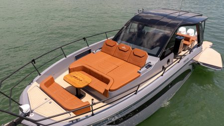 Criada no estaleiro Way Brasil, com sede em São José dos Pinhais (PR), a Triton Flyer 44 reúne diferenciais que impressionam até os mercados mais exigentes. O modelo conta com duas aberturas laterais na praça de popa que aumentam significativamente o espaço de convivência a bordo, além de uma proa versátil, com mesa e sofás, que pode ser usada como lounge ou área de solário. O projeto walkaround favorece a circulação e amplia o conforto em navegação.