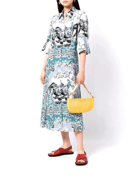O vestido Hipismo Estampado, da Olympia, retrata tudo que há de elegante e luxuoso na vida do campo. Com estampas que remetem ao hipismo, as franjas nas amarras ganham destaque por remeterem às crinas de cavalos.