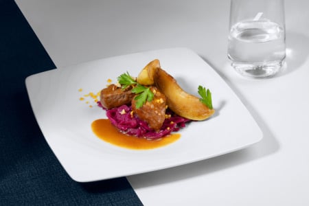 Na sua rede de voos de curta e média distância, a Air France também oferece uma seleção gourmet refinada. No lounge do Terminal 2F no Aeroporto Paris-Charles de Gaulle, o chef estrelado Michel Roth, vencedor do Bocuse d’Or e Meilleur Ouvrier de France, agora assina uma variedade de pratos deliciosos. Para criar um menu rico e variado, ele fez parceria com o talentoso Josselin Marie, um chef comprometido com a culinária responsável e vegetariana. Uma dupla original de chefs que ilustra a determinação da Air France de se inspirar nas raízes da alta gastronomia francesa e promover jovens talentos promissores da culinária inventiva de hoje, com o objetivo de transferir e compartilhar o know-how. Com o frango ao vinho tinto com lardons, acompanhado de gnocchi frito na manteiga, mistura de cogumelos e cebolas peroladas de Michel Roth, e o aveludado de aipo com truffonade e picles de aipo de Josselin Marie, os dois chefs apresentam novos pratos quentes que mudam conforme as estações e complementam a oferta disponível no lounge.