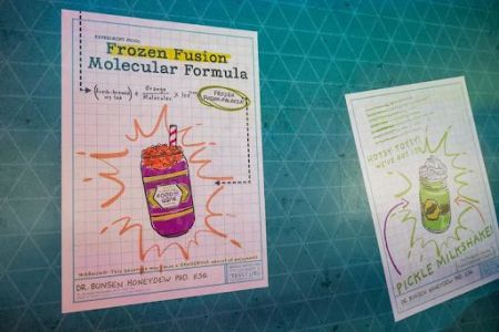 As bebidas “Pickle Milkshake” e o “Frozen Fusion featuring Twinings Pomegranate and Raspberry Herbal Tea fused with Orange Ice Cream Molecules”. (Foto: divulgação)