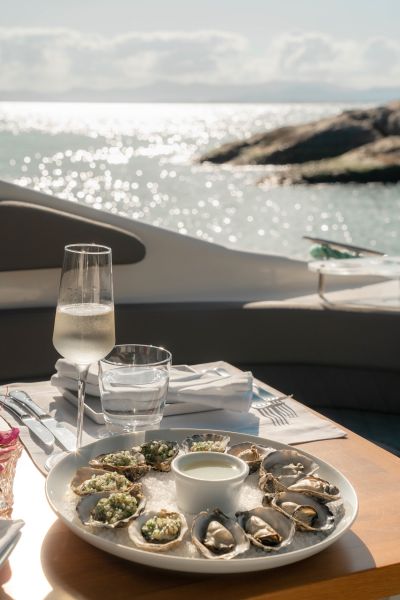 Em clima de celebração do ingrediente, a dica é embarcar em um passeio a bordo de um genuíno barco pescador ou de uma moderna lancha para, além de admirar a bela paisagem da Costa Esmeralda pelo ângulo do mar, contemplar esse cenário degustando ostras frescas com taças de espumante.