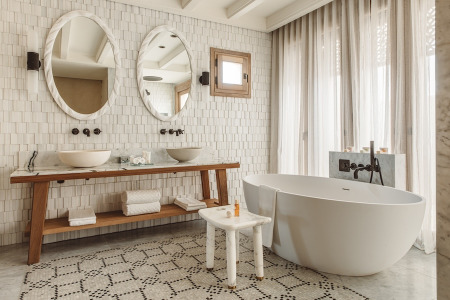 Os hóspedes podem escolher entre 55 suítes e vilas, cuja arquitetura mistura elegantemente o estilo contemporâneo com a tradição marroquina. Seus interiores, com sutis referências ao mar, combinam os melhores e mais autênticos materiais do país com o inestimável design e a experiência artesanal do Marrocos. As suítes e vilas oferecem vistas panorâmicas do mar, dos jardins exuberantes e das montanhas Rif. Todas possuem amplo espaço: desde 80 m² para as suítes de um quarto até 1.700 m² para a Villa Royale de três quartos. Cada vila tem um mordomo dedicado, elevando a arte do serviço e da hospitalidade marroquina a novos patamares, profundamente enraizados no DNA da Royal Mansour Collection. As Privilege Seafront Villas também têm sua própria piscina, separada da praia por uma pequena duna para privacidade.