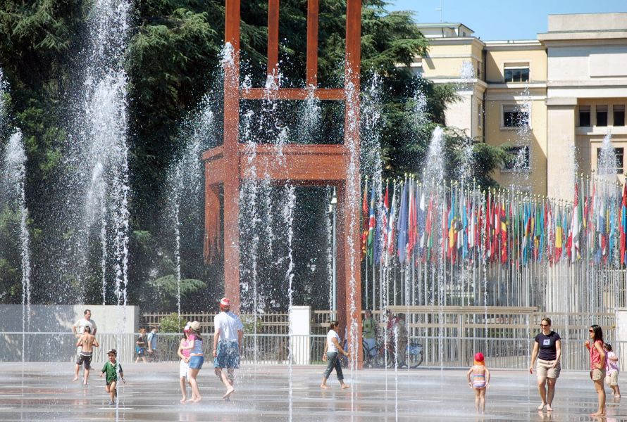 Não longe dali, a Praça das Nações é uma conclamação à paz e à política desarmamentista. Ali está a Cadeira Quebrada, escultura superdimensionada do suíço Daniel Berset, que lembra as vítimas das minas terrestres.