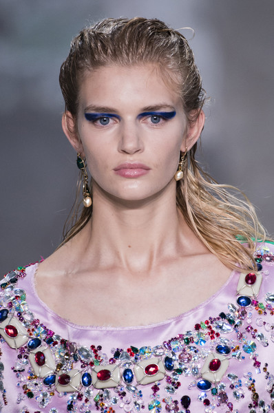 O olhar de Missoni era sobrenatural, de tirar o fôlego: sombra pastel iridescente em forma de olho esfumado invertido e pele luminosa. A maquiadora Lynsey Alexander deu às modelos bochechas perfeitamente realçadas, além de oferecer uma nova visão interessante sobre olhos metálicos.