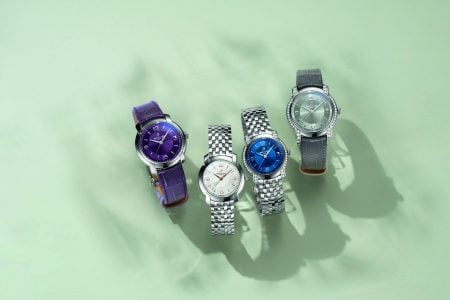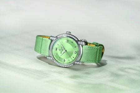 Nas variações azul ou preto, diamantes cascateiam em volta do mostrador em curvas orgânicas. O mostrador conta com três estilos de acabamento – cetim no centro, escovado circular ao redor dos índices e um acabamento sunray – que juntos criam uma superfície luminosa e em constante transformação. Algarismos minimalistas, ponteiros em losango e uma coroa escultural completam um visual que veste como uma joia.